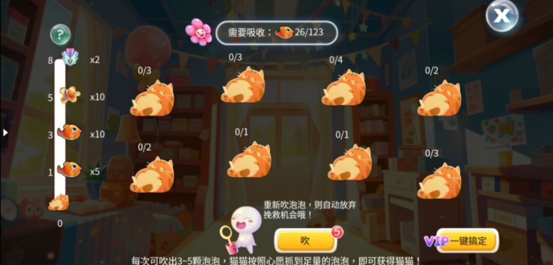 在吹泡泡玩法中,每次可吹出3-5颗泡泡,猫猫按照心愿收集到足够数量的泡泡即可获得猫猫,累计猫猫数量还可以额外获得进度奖励。