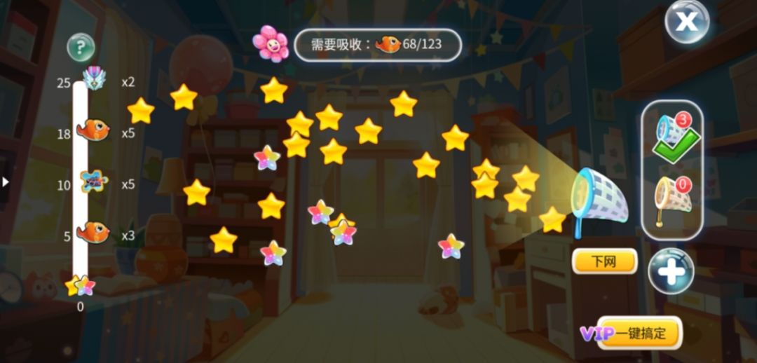 在捕网玩法中,黄色星星和彩色星星会飘荡在空中,在星星们靠近捕网时下网,捕捉更多的星星,累计星星数量还可以额外获得进度奖励。