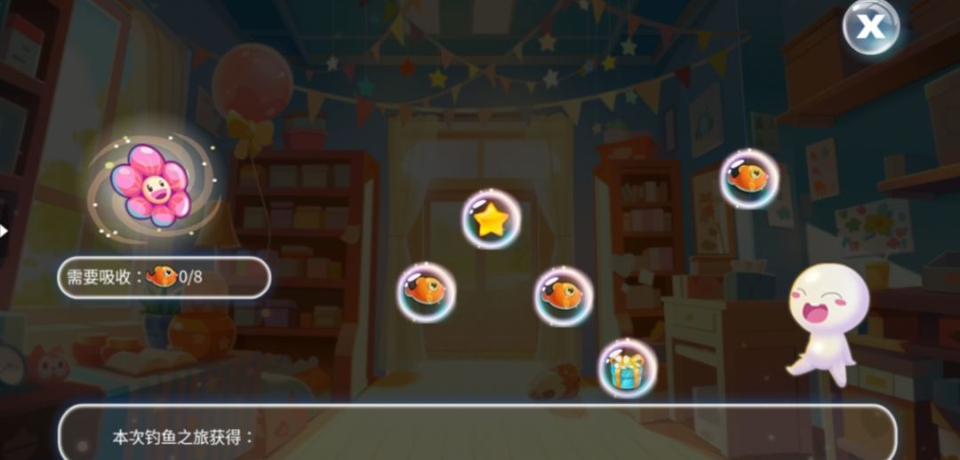 目标:获得小红鱼、猫猫、星星和小花朵
