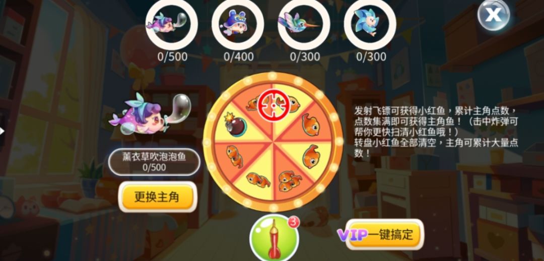 在飞镖玩法中,点击发射飞镖,可以获得不同数量的小红鱼。左侧可以选择您心爱的主角鱼儿,清空转盘上面的小红鱼可以获得主角点数,集满点数即可获得主角鱼!