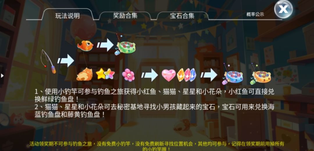 1、本活动分为三部分:钓鱼之旅、我的秘密基地、奖励兑换。