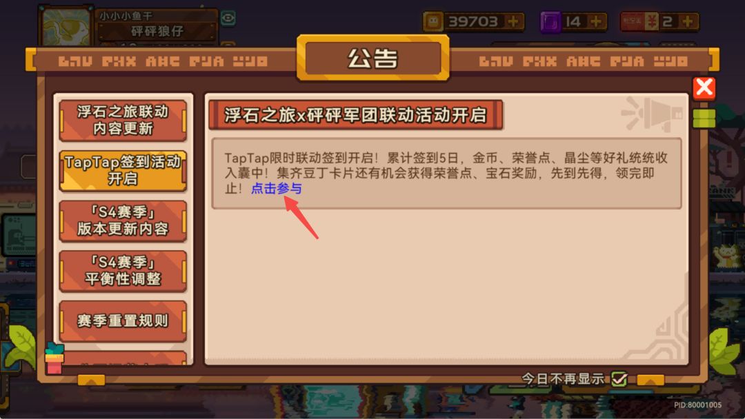 方式一:在游戏公告处,进入“TapTap签到活动开启”栏目,触碰“点击参与”按钮即可成功跳转活动页面。