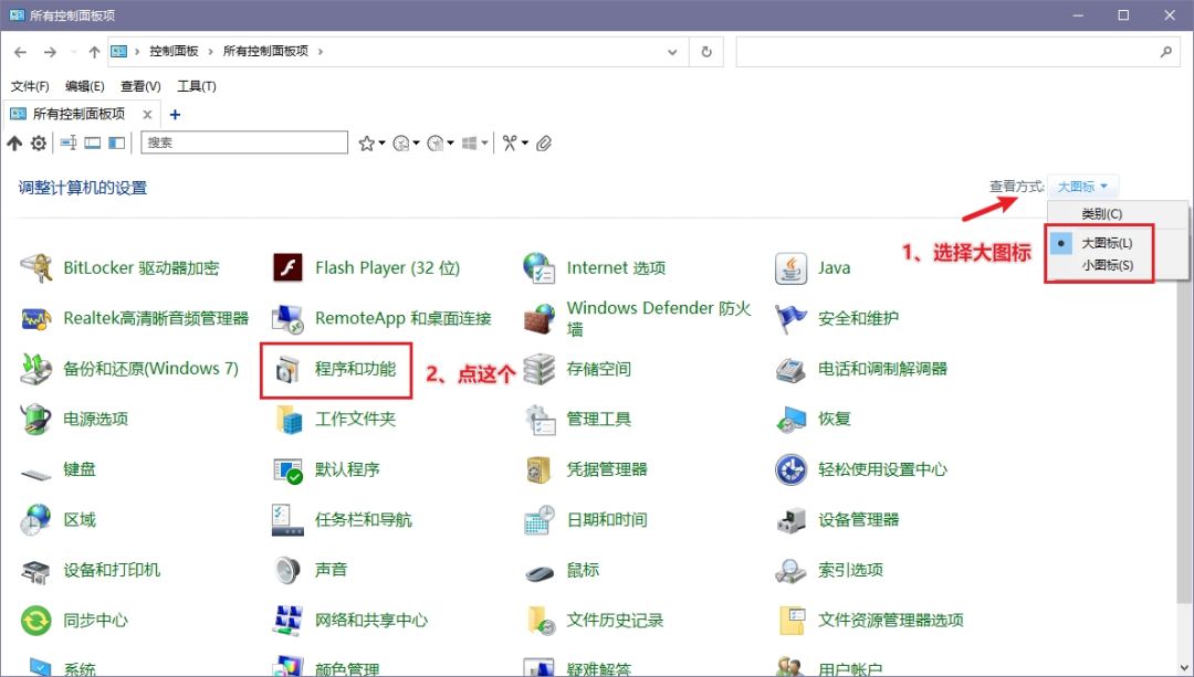 2)在“控制面板”中查看方式选择“大图标”,找到“程序和功能”,点击打开。
