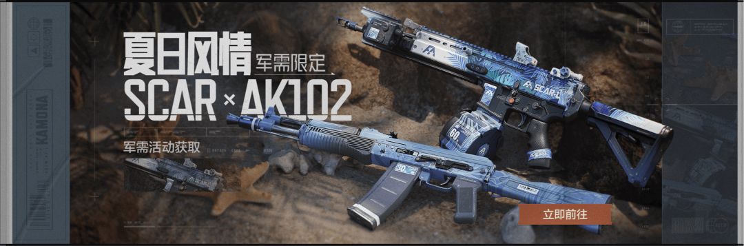 活动期间,消耗军需卡参与活动,至多参与5次活动,更有机会获取枪械涂装【夏日风情·SCAR】、【夏日风情·AK102】等限定外观奖励!