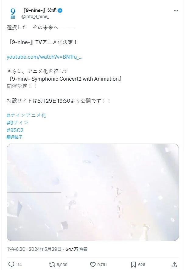 近日,《9nine》官方通过推特发帖说将会有新东西,最终宣布游戏即将动画化。官方为庆祝动画改编,决定在 2024 年 9 月 8 日举行「9-nine- Symphonic Concert2 with Animation」(9nine动画交响音乐会),官方已开启了特设网站,可以查看音乐会的详细信息,在日感兴趣的朋友们可以关注一下。