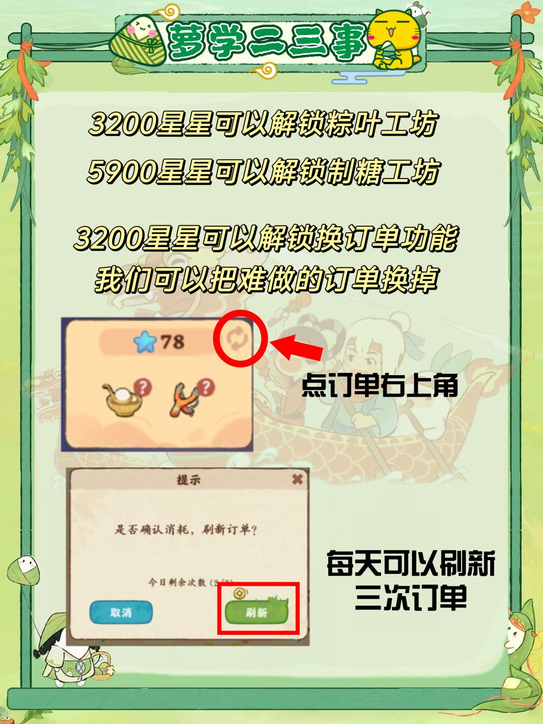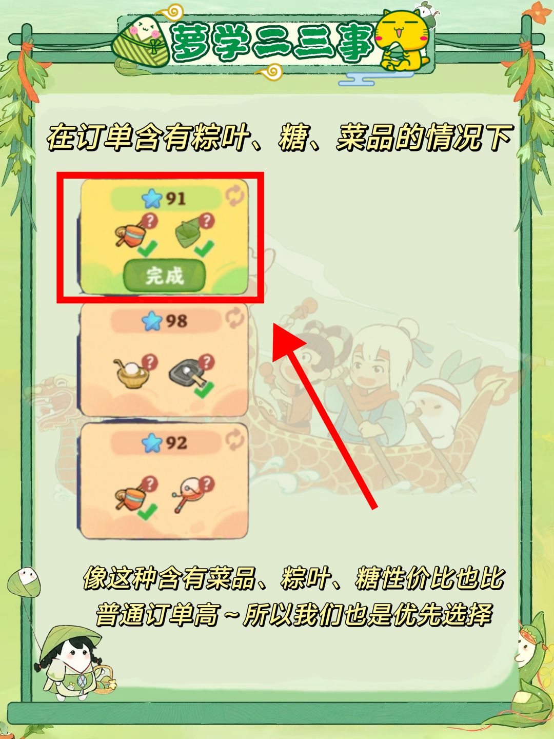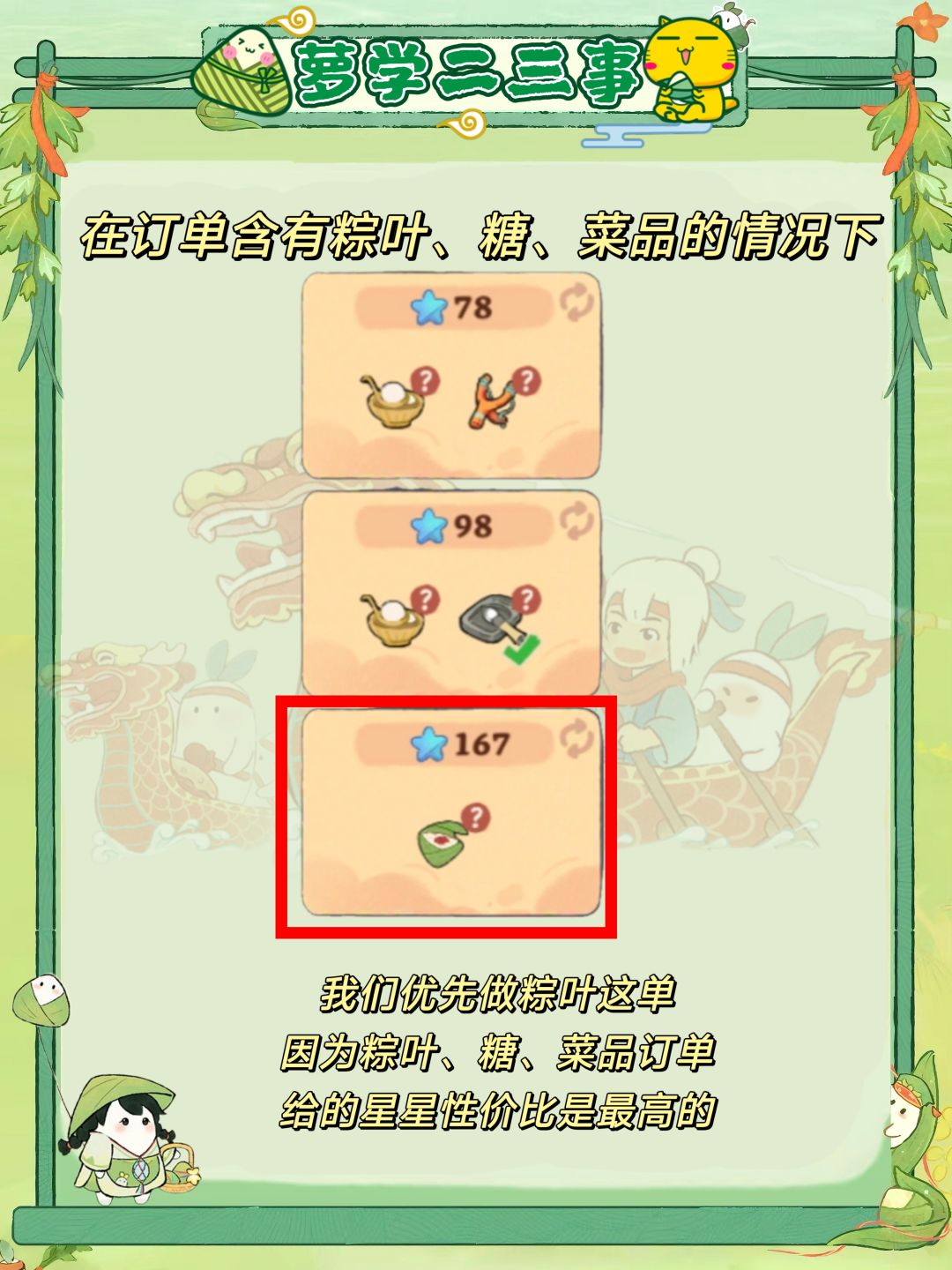 1.有效挑单可以减少体力的消耗,用较少的体力做性价比最高的单。简单来说就是优先做含有粽叶、糖和菜品的订单(粽叶和糖会随着游戏进度解锁工坊),没有这三种的情况下优先做低级物品组成的单。