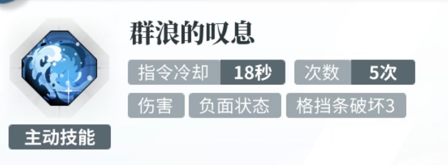 主动:汇聚水流,以3级[位移强度]牵引自身周围半径500的目标,造成600%最终攻击的水元素伤害,并附带破坏3段格挡条效果