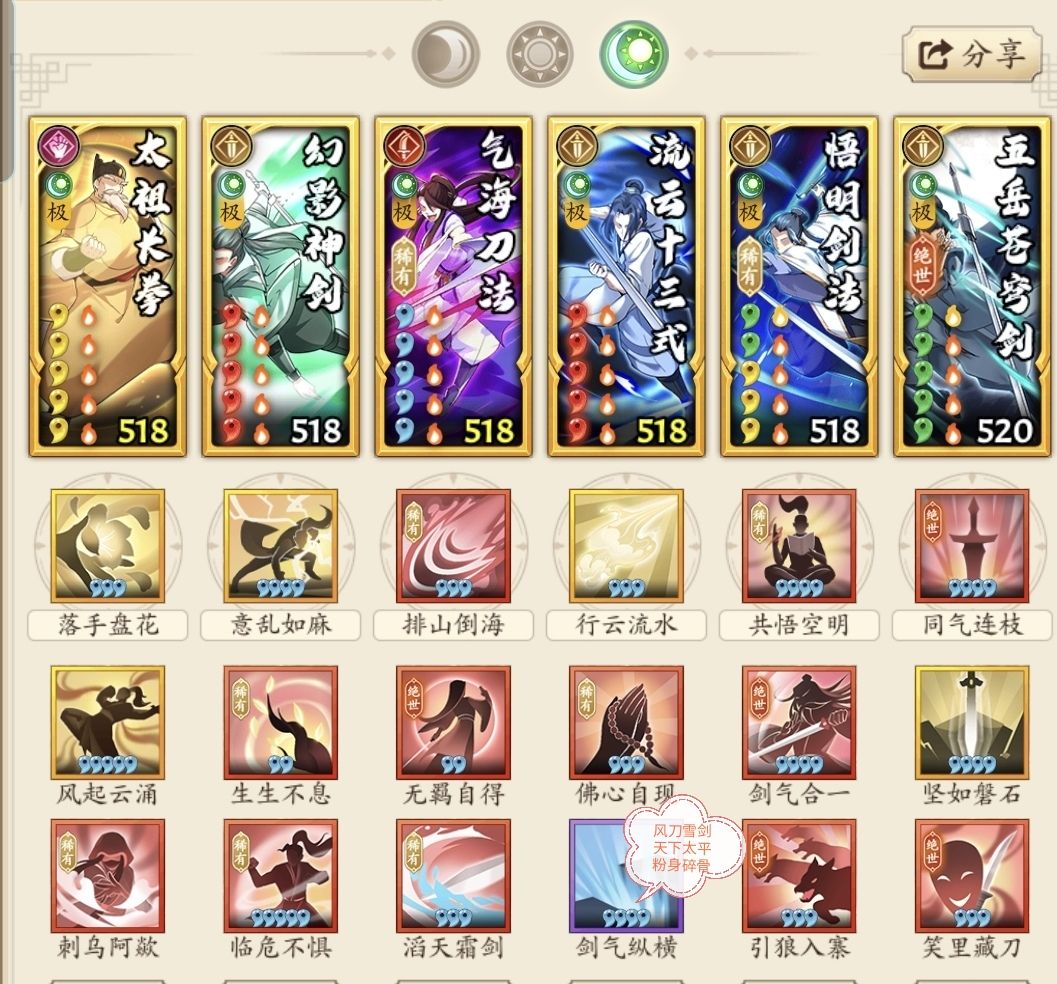五手悟明剑法加引狼剑气合一拉聚气和增伤,剑气合一加暴击配合五岳笑里暴击。