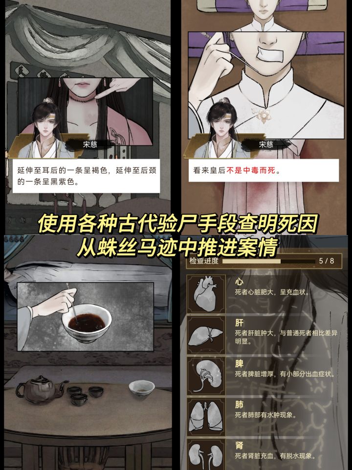 游戏里我们要跟随宋慈的视角,查探8个冤案奇案,使用法医手段和动机检测,推理出案件的真相,揪出凶手。