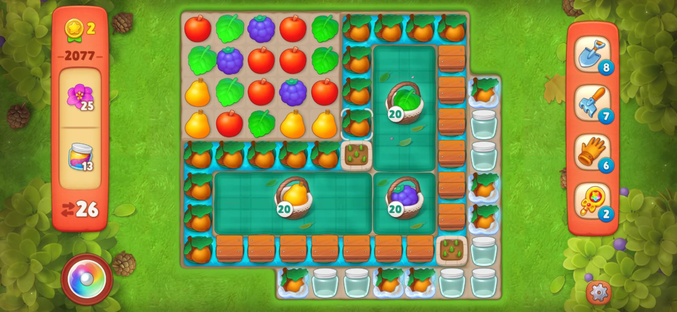 整体构想:先将分界线的橡木消除,接触到花盆,收集花朵。在消除橡木的同时,进行野餐布的收集,打开整个局面。局面打开后将先将果酱罐充满,之后再用大范围消除的道具消除果酱罐。不建议一个一个消除果酱罐,浪费步数,而且很难。