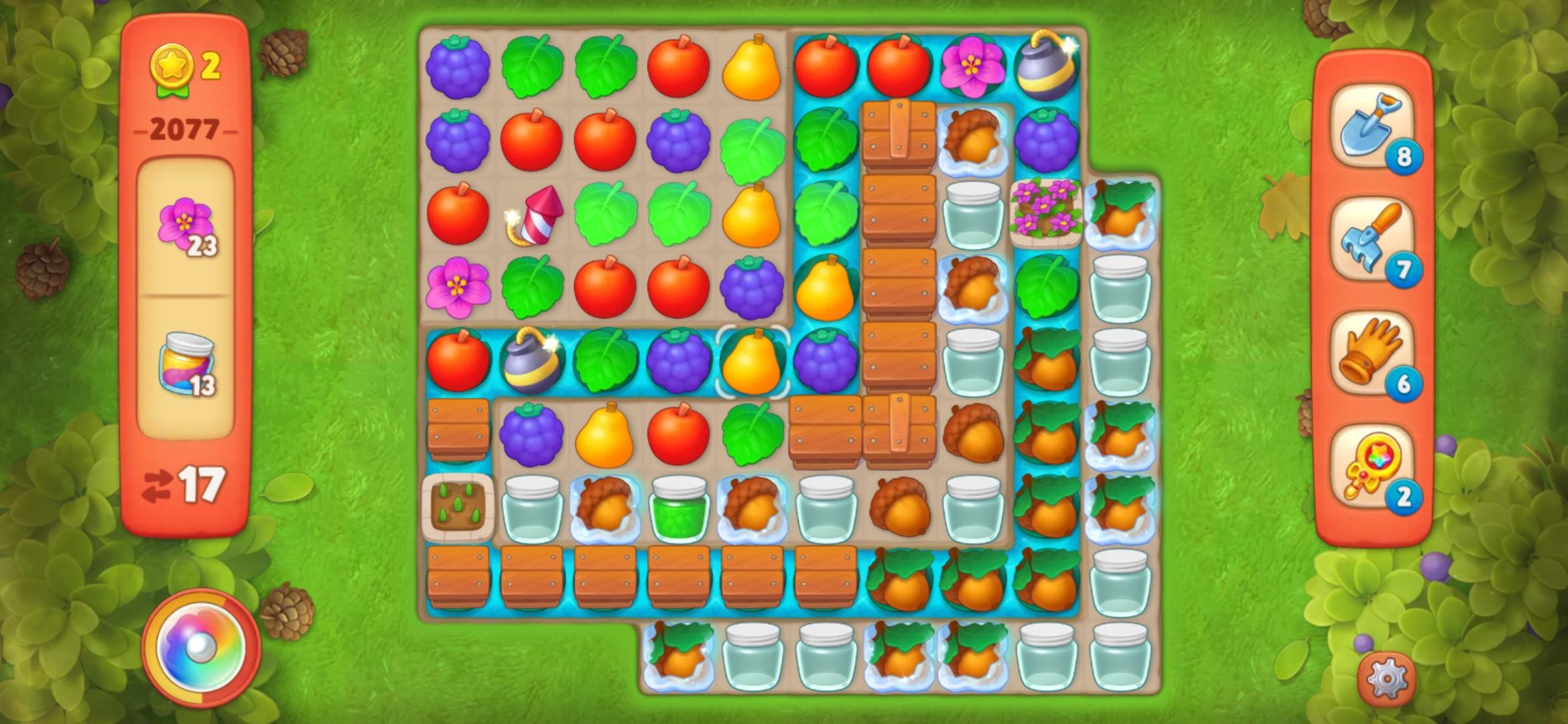 总结:❶明确步骤,先消除分界线的橡木和野餐布,然后去灌满果酱罐,在利用大范围消除道具去消除果酱罐。花朵的收集,可以在用大范围消除道具和收集果酱罐的时候,覆盖一下花盆,或者在剩余几步时,再重点关注一下。❷填充果酱罐时,可以使用彩虹球作为辅助工具。消除果酱罐时,必须要用大范围的消除道具。❸这一关步数不少,所以可以不用着急。在没有办法靠近目标的时候,先在周围去攒一些大范围消除的道具,然后去积攒彩虹球。❹橡木不重要,除非必要情况,否则可以不去理会。