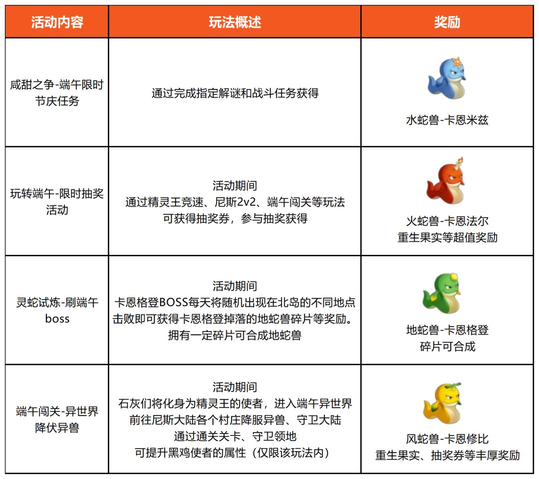 据说,端午节最初的起源与蛇有关,而蛇作为石器的经典宠物形象,也将在这个充满传统韵味的节日到来之际登陆尼斯大陆,与玩家们见面。这次项目组带着满满的诚意,玩家可通过限时活动,免费获得4款不同属性的端午兽,同时还有重生果实等丰厚奖励。活动内容也与往期不同,除了限时跑图刷怪的活动外,还有限时抽奖、角色扮演放置类小游戏,让玩家一次性体验多种丰富有趣的内容。