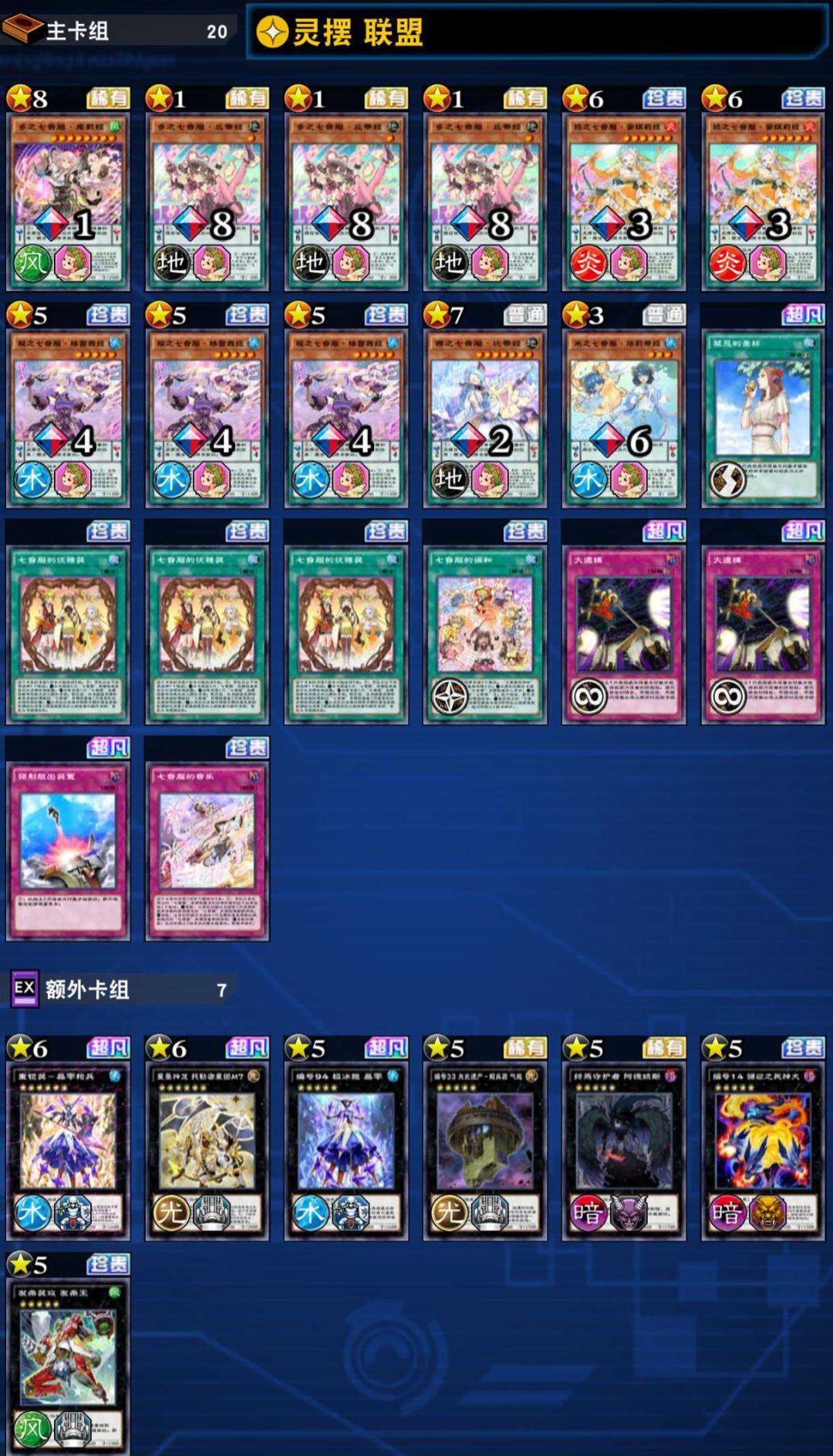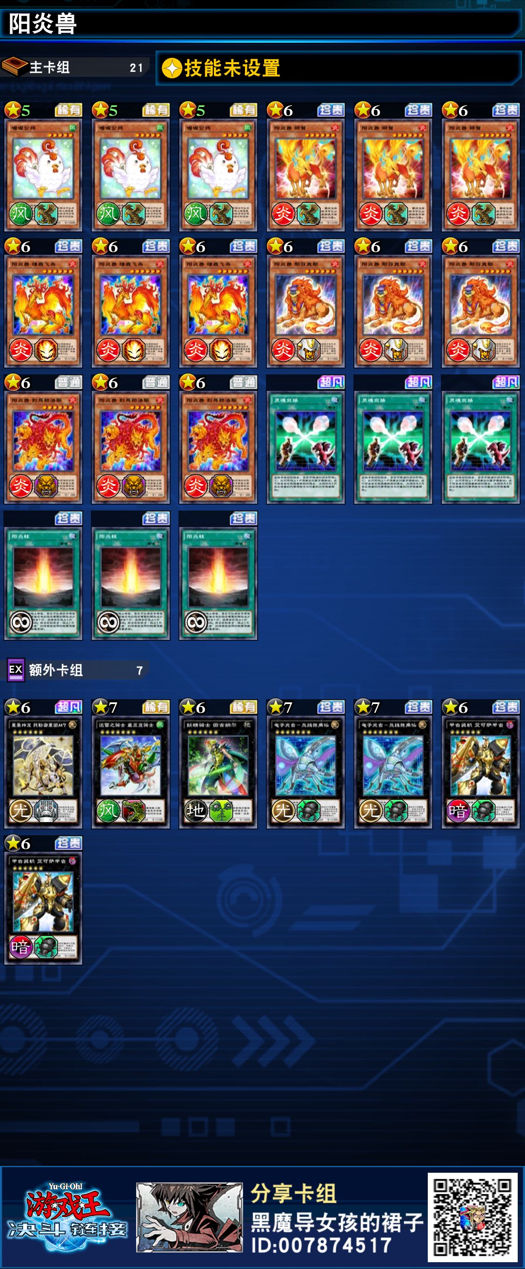 阳炎兽作为开服时期的卡组,也是在几个包前才把全家卡出了,但本身都是高星,且依靠统招和鹿展开,系统比较落后。但本家全家不取对象,属于很强的抗性了,投入灵魂交换(可替换为其他特招点)和喔喔公鸡和阳炎珠作为辅助展开手段。额外超量来提升上限。刷路人还可以,排位就算了。个人很喜欢阳炎兽,希望有生之年能有补强。
