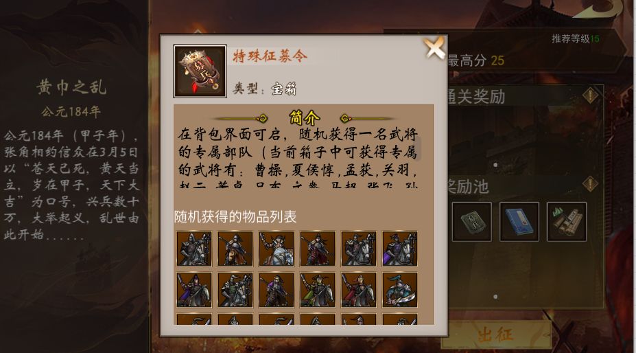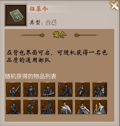 高级征募令极低概率掉落的特殊征募令,开启后随机获得一只专属部队;挑战的关卡难度越高通关分数越高,其掉落概率越高