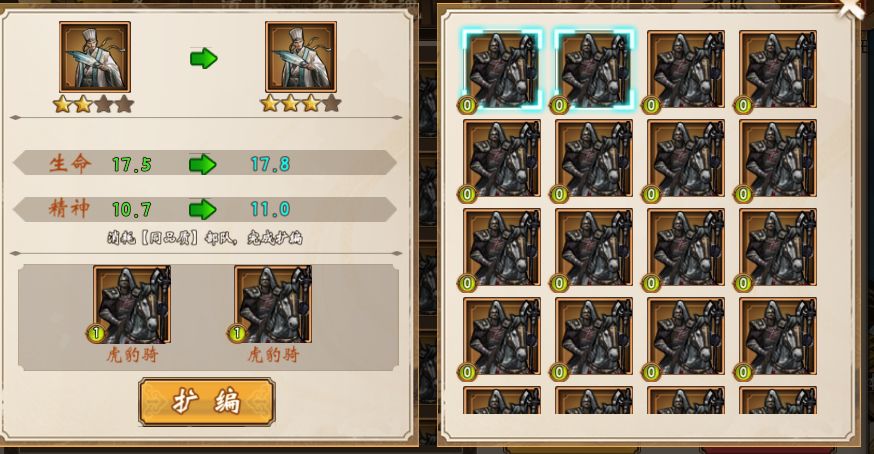 品质提升 在达到紫色品质前,每次品质提升需要消耗另外3个同品质的部队作为材料进行品质的提升