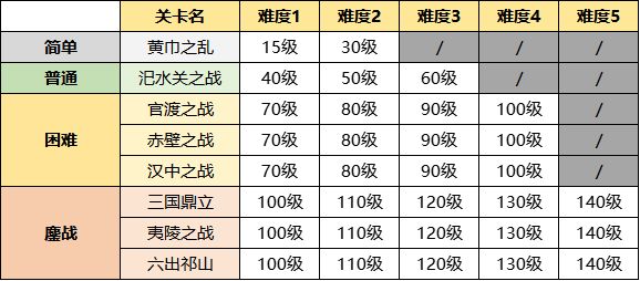 开启限制 当主公等级达到对应要求时解锁(例如普通级别的关卡(汜水关之战)在主公等级>=40时解锁,困难级别的关卡(官渡、赤壁、汉中之战)会在主公等级>=70时解锁) 若玩家能够挑战并通关前一级别关卡的最后一个难度时,也可以提前开放解锁(例如当通关汜水关之战难度3的挑战后,解锁困难级别的关卡)