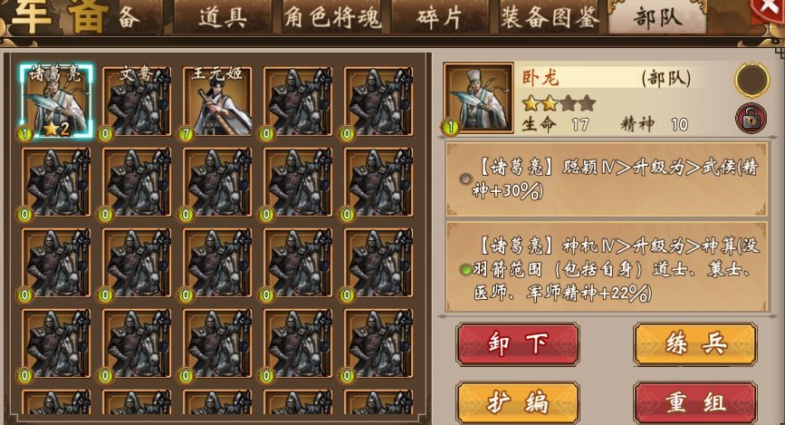 等级 每只部队都会有自身的军队等级,该等级会影响部队所能提供的部队属性;可通过练兵来提升,练兵道具可通过玩法“秘闻录”来获得