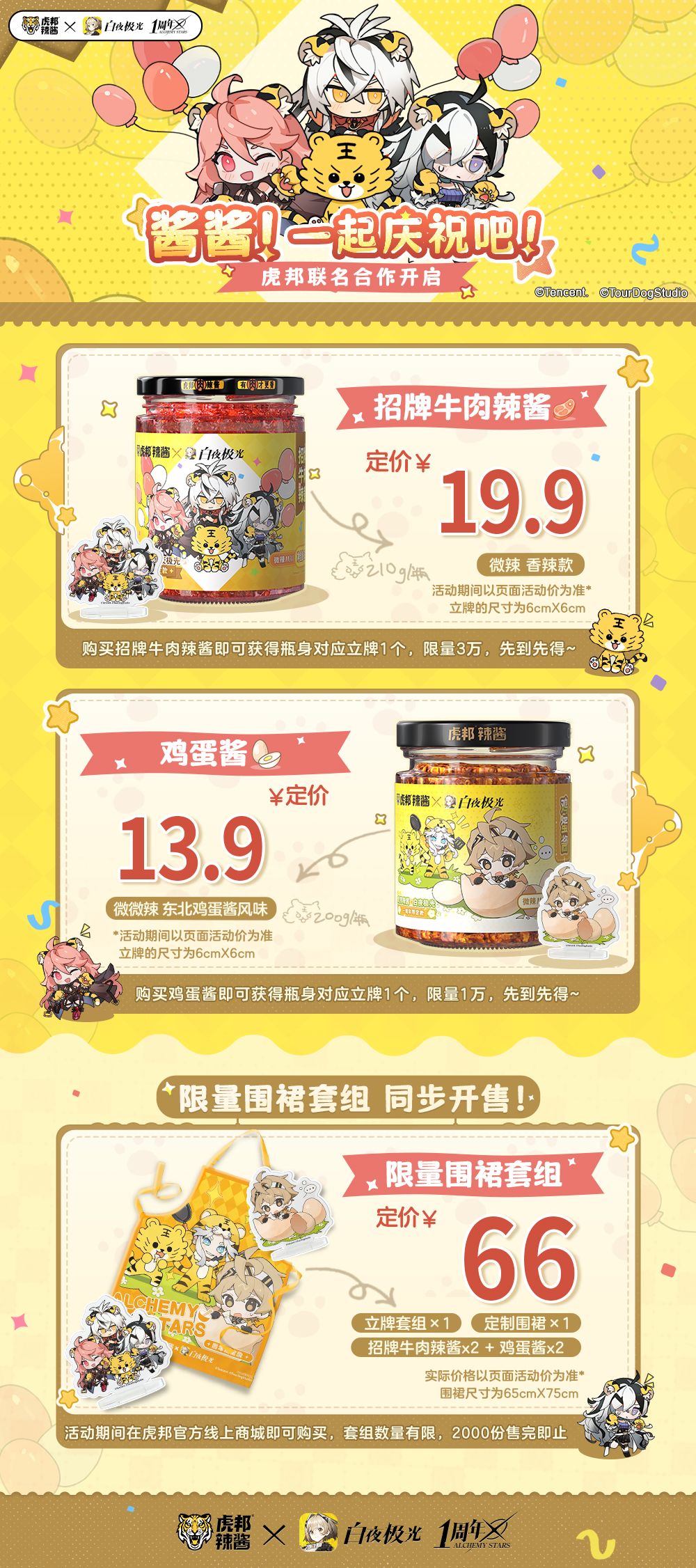 白夜极光虎邦联名款「招牌牛肉辣酱」与「鸡蛋酱」于今日20点现货开售,随赠限定联名立牌,更有可以让导航员们化身大厨的限量围裙套组等你选购!