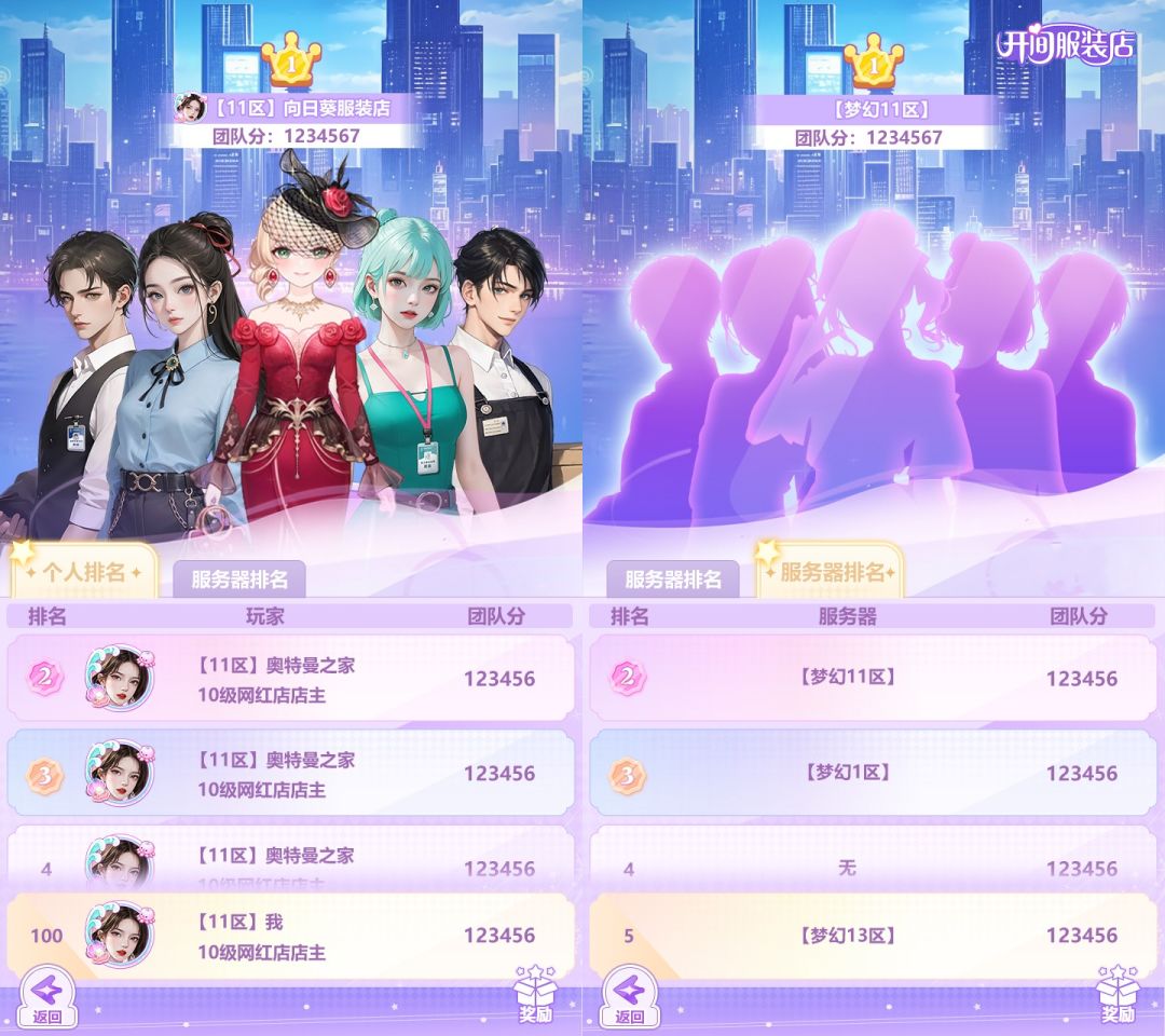 本活动设计有个人榜和服务器榜,可获得闪耀团队奖章(效果:增加品牌度和粉丝数。该奖章可升级)、彰显团队荣耀的服务器标识,以及其他丰厚奖励