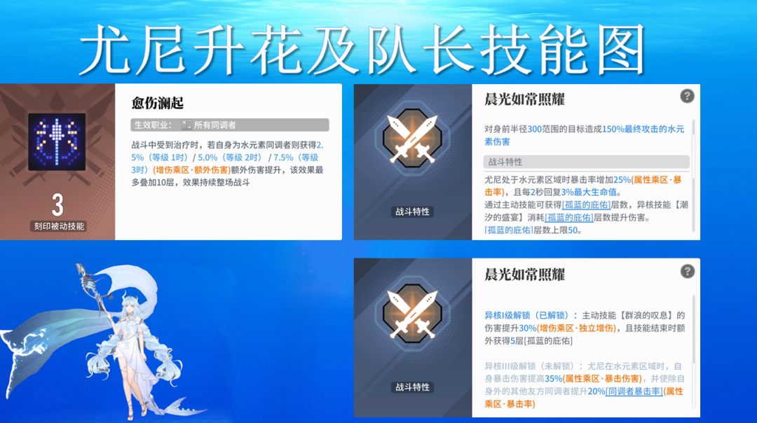 ①:一技能:尤尼主要输出技能之一,自带融甲,一花一技能可叠12层孤蓝庇佑,0花7层。