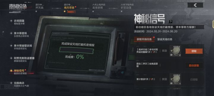 暗区突围开始了福利活动分别是“神秘信号”和“储蓄罐”活动,活动内容简单,神秘信号活动只需要每日登录参与对局就可以获得信号天线,带着信号天线进入对局就到达指定地点就可以完成任务,任务完成给予大家自选势力币奖励,实力币能在联络人处兑换许多的优质武器弹药装备。