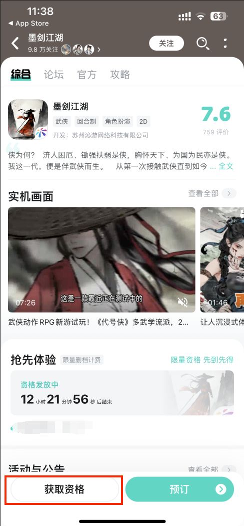 3)在《墨剑江湖》游戏详情界面点击“获取资格”按钮。