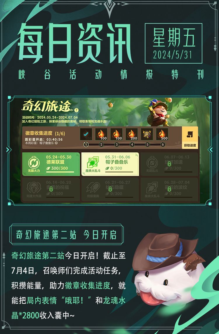 与此同时,奇幻旅途的第二站也已同步开启!截止至7月4日,召唤师完成活动任务积攒能量,即可成功收集徽章,领取局内表情“哦耶!”及龙魂水晶好礼~