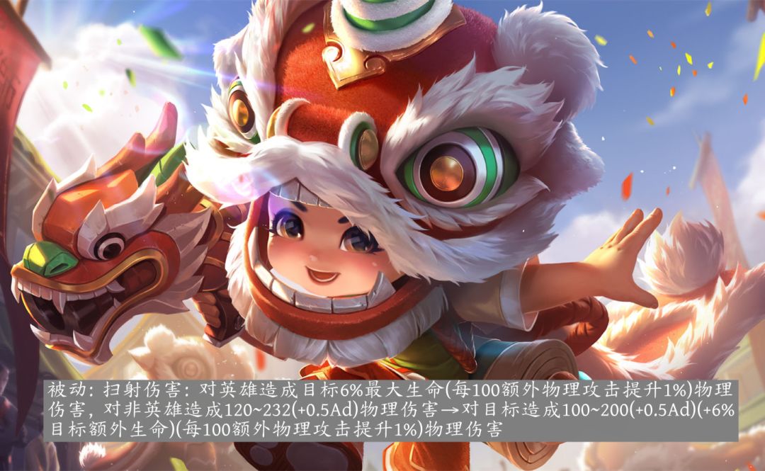 调整前的10%最大生命值伤害,鲁班七号的被动扫射可以对夏侯惇造成1330点伤害,调整后是200+0.5AD和10%额外最大生命值,可以造成1156点伤害,降低了173点,占了调整前的八分之一,是一次幅度较大的削弱调整。