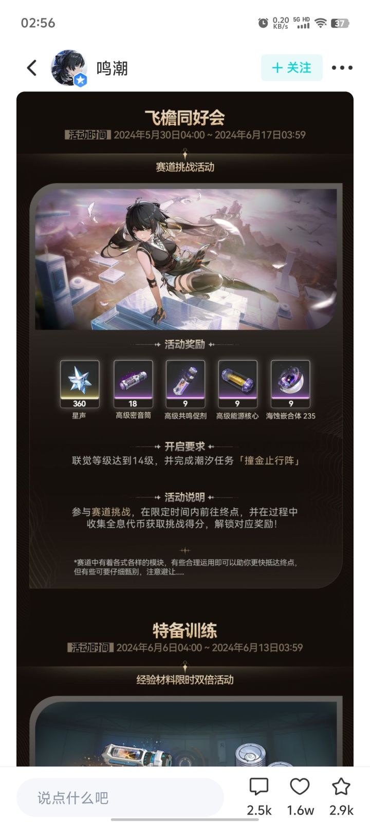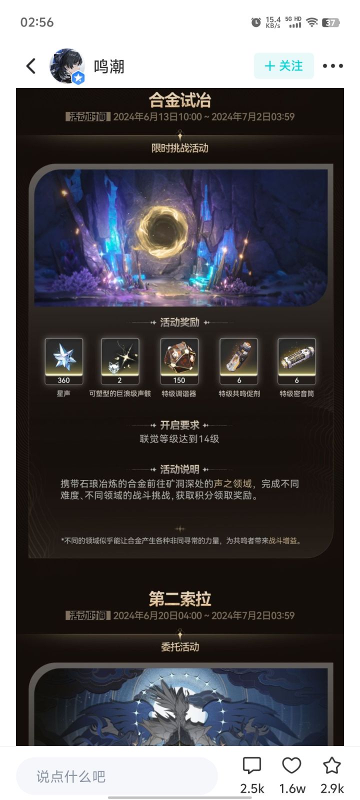 第二个大活动开启时间为第一个大活动结束前四天,即6月13日开启,活动可获取星声为360,合2.25抽,每日平均获取星声为20。