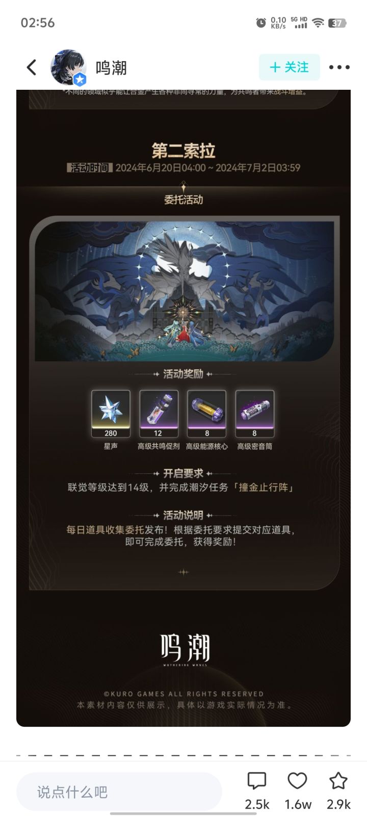 活动总结:观察鸣潮公告,自5.23开服到7.2日两个活动同时结束,版本持续时间为四十天,活动可获取心声共计1000,合6.25抽,每日平均获取星声为25。