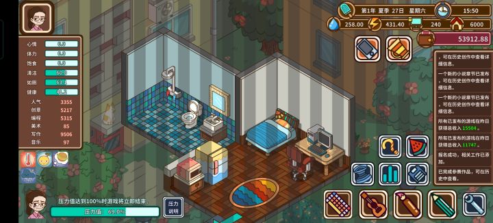 前期的运营 :开局一本免费小说直接流行的对应小说选免费的两三天更新一次,主要是攒没多少的人气和时不时的正面,可以拖点时间。 剩余的时间先把免费的编辑学完,然后把写作的创意800拿下,不一点点编辑就可以直接创建流行游戏 这边建议,前期选休闲/解谜/模拟等等,花更少时间能制造的游戏,主打一个性价比 ,不要怕,花钱一定要请外包初级的就够了,记得尽量参加每个季度的比赛首季度一个比赛,能加200人气是前期起来的关键,之后就是学习、更新小说和继续创建游戏。