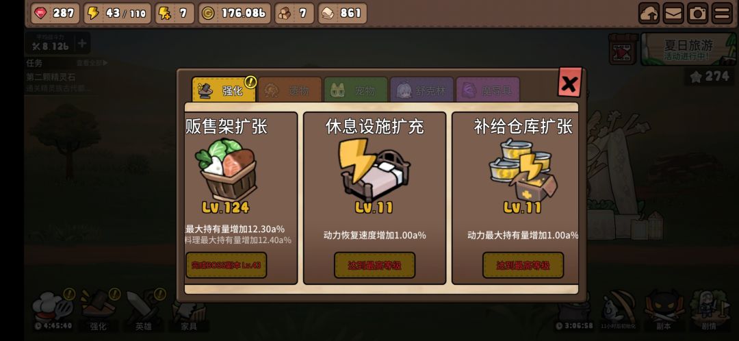 注:随着BOSS挑战级别越高,卖菜时长上限也会增加。作者目前BOSS等级LV114,卖菜时间从基础的7小时20分钟?(大概)上升至7小时54分钟