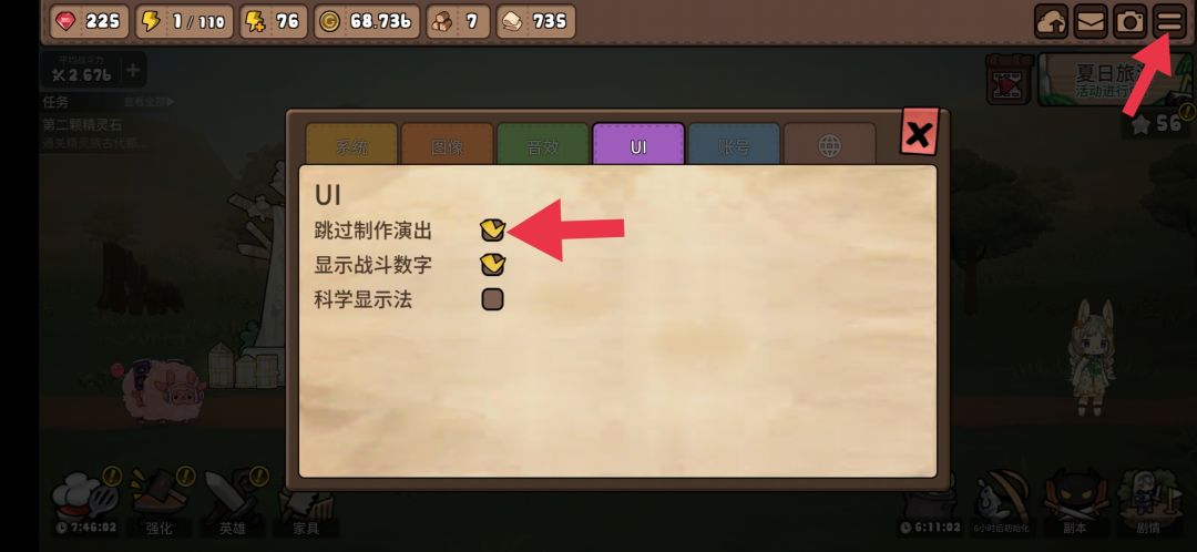 点击右上角菜单键-UI跳过制作演出去掉升级动画,有效提升游戏体验