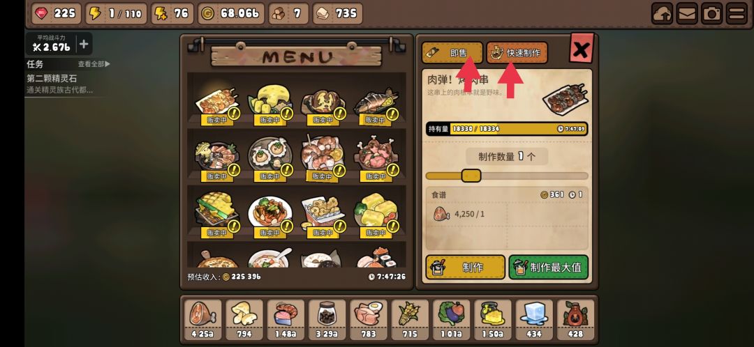食物素材数量会随着推进程度越来越多,能打得过的话尽量多推进几关再卖菜,这样收入会更高