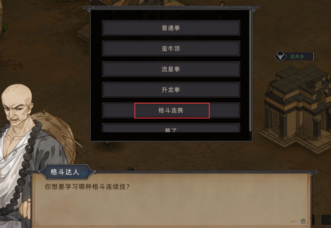 首先,要在NPC处学习连携被动技能,以格斗系为例,首先要在花卉乡格斗达人处,学习连续技格斗连携,如下图所示: