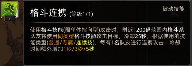 学到如上所示技能后,使用特定类型技能(单体指向型)攻击敌人时,自身周围一定范围内的格斗系队友会同时发动技能攻击敌人。