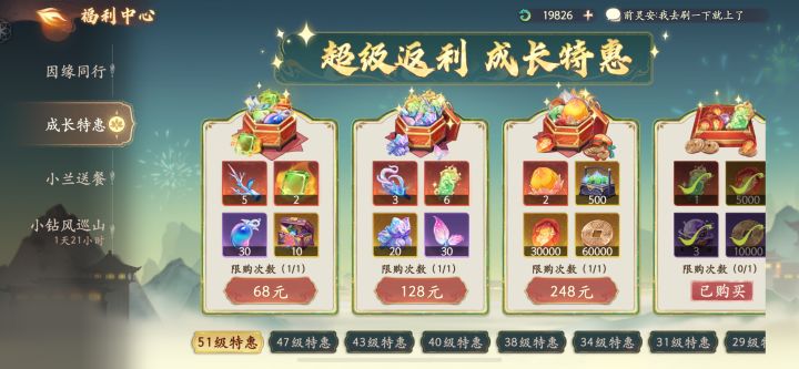 51级特惠:68礼包:神木灵枝*5 128礼包:神木须根*3