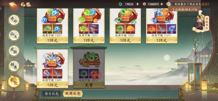 双周礼包:两个128礼包:神木灵枝*5 神木灵枝*2