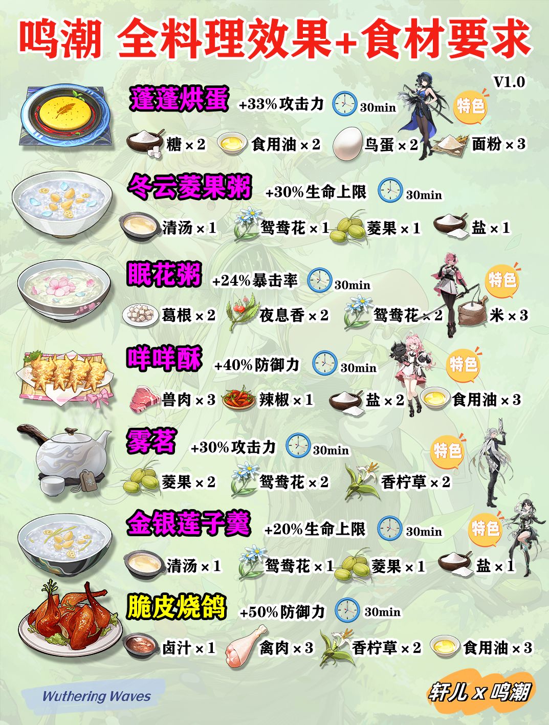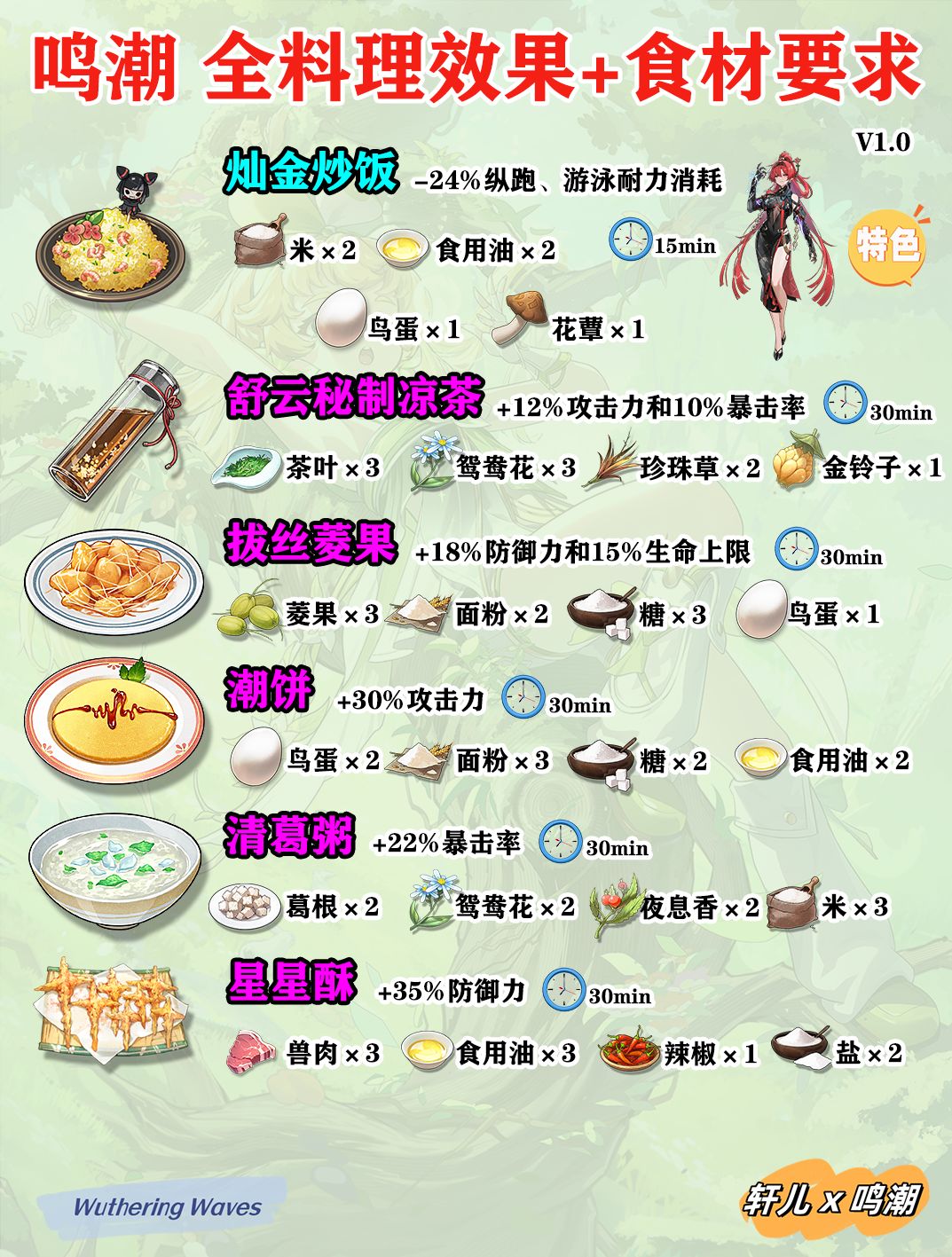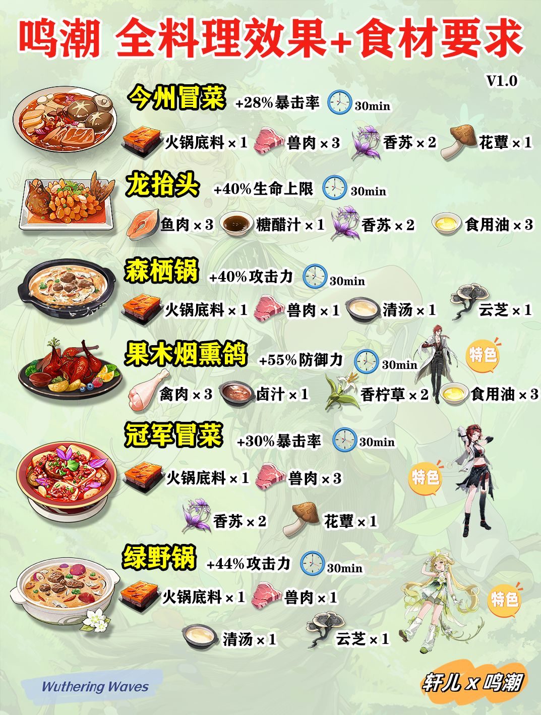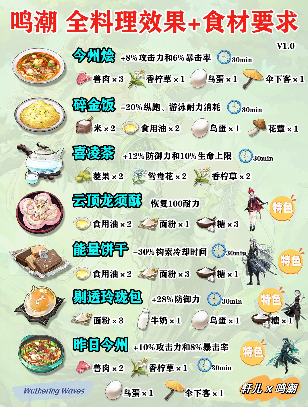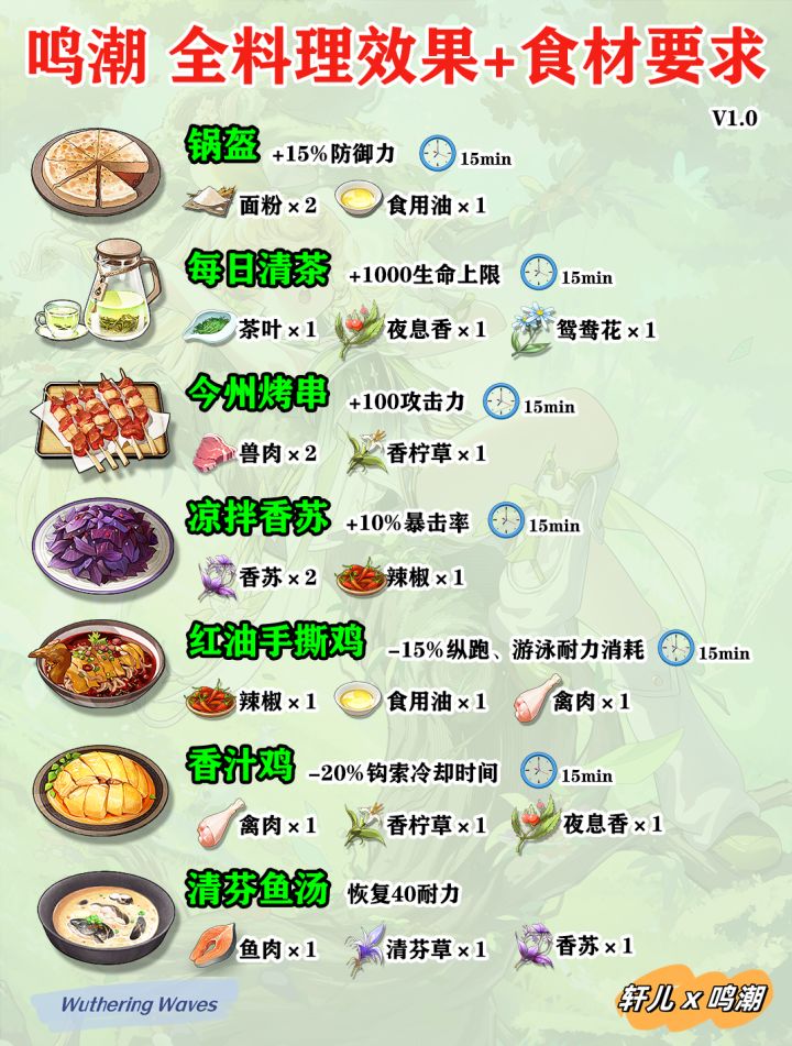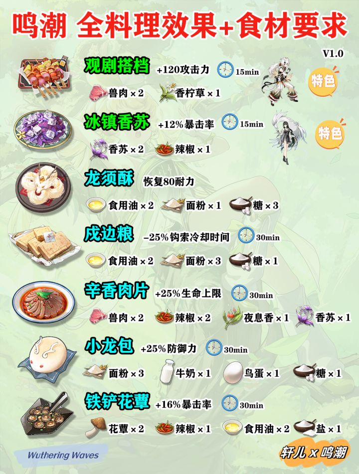 鸣潮所有菜谱食材收集效果一览,制作食材需求,角色特色料理,鸣潮新手入坑必看攻略,大世界探索更节省时间,战斗更猛