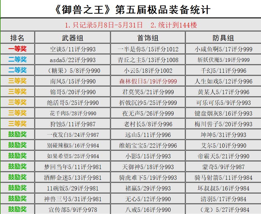 《御兽之王》第五届欧皇大赛获奖名单