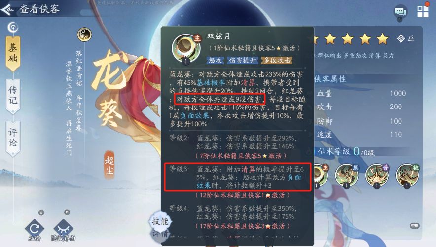 在技能方面,蓝龙葵具备一项强大的清算技能。当携带清算的侠客在战斗中阵亡时,会对敌方造成基于其攻击面板的120%真实伤害。然而,这一技能的触发条件较为苛刻,且伤害比例相对较低。若能将伤害比例提升至300%,无疑将极大地增强蓝龙葵的实用性,使其在战斗中发挥更大的作用。