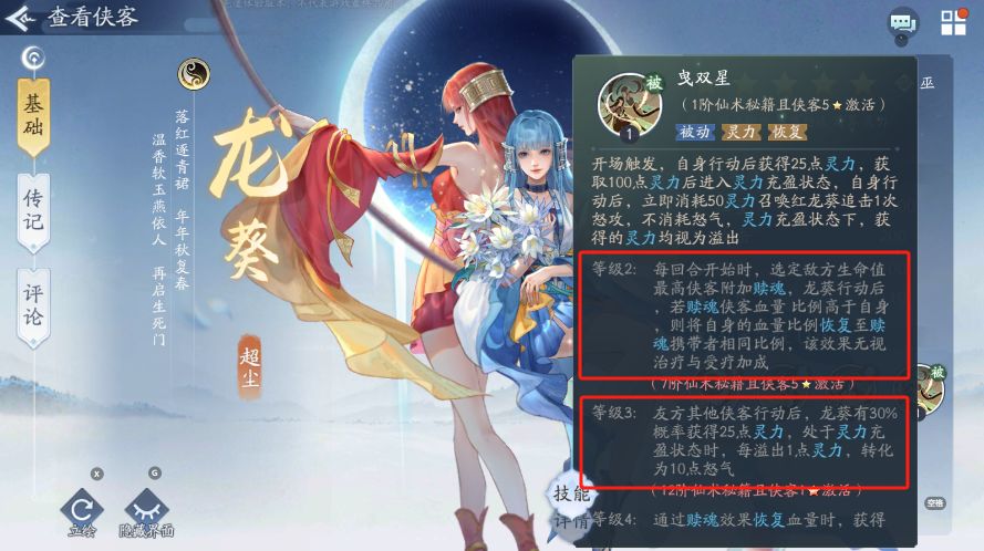 等级3:友方其他侠客行动后,龙葵有30%概率获得25点灵力,处于灵力充盈状态时,每溢出1点灵力,转化为10点怒气