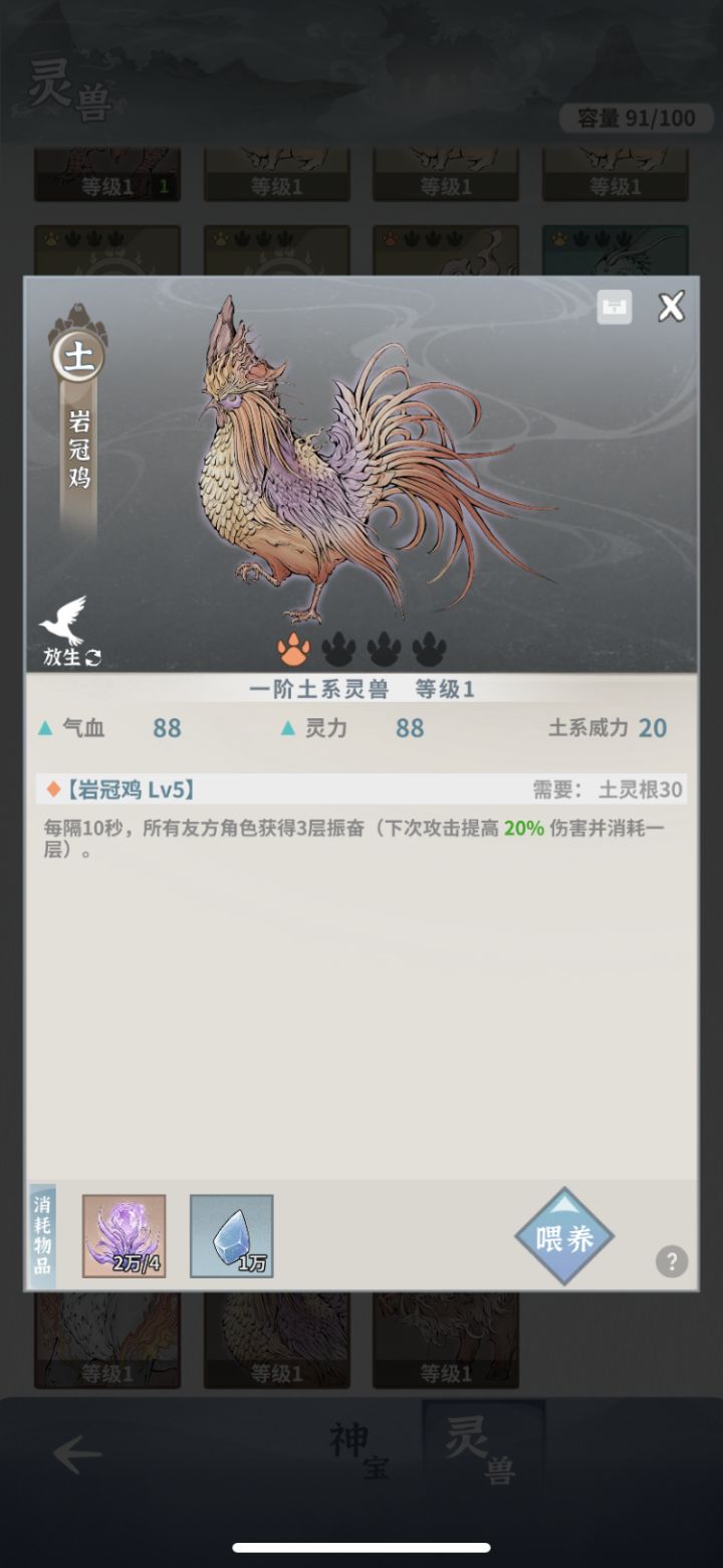 )图①图②的灵兽都是一阶灵兽,且此两灵兽技能等级都是最高等级5级,将图中任意一只灵兽作为主灵兽升级到1阶段10级时会有一次升阶机会,这时将另一只5级技能的灵兽作为副灵兽(狗粮)丢进升阶界面,花费一点高阶灵石加灵兽升阶材料就会得到一只拥有2个5级词条的二阶灵兽。