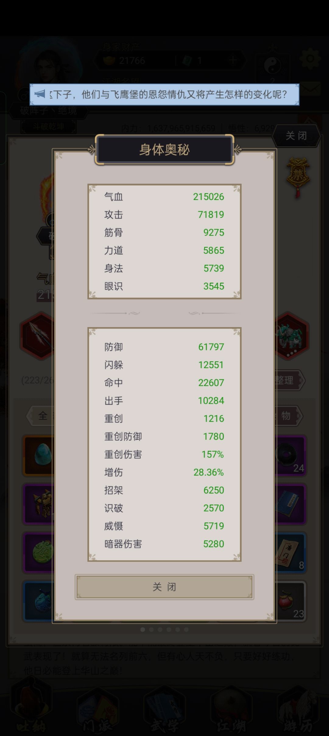 6.1过图青衣历时23天,中丹田50,弟子5个,拳御48,刀御60,剑御70,棍御60,腿御55,枪御40,无地龙,反击70
