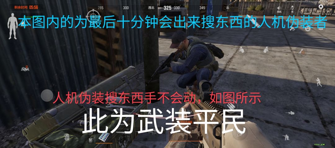 我们可以看到,类似这种,带个鸭舌帽,穿着蓝色工人装的武装平民,如今依旧是在农场存在的。而图中这个稍微特殊一点,是电脑操控的伪装者,会按照伪装者的行动逻辑在最后十分钟内全地图到处跑去搜东西,会开箱子但手不会动。但除去这种特殊案例,地图上刷新的不会到处乱跑,只在固定区域巡逻的武装平民也是有的。