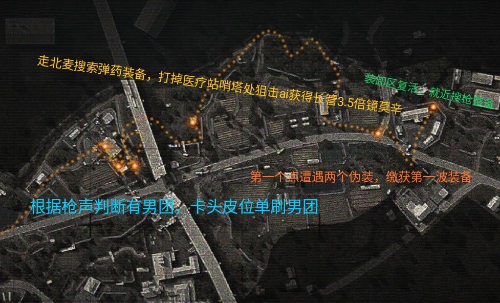 基本上来说,伪装的思路就啊开局找枪找头甲,有枪有甲就找包找子弹,然后快速往高资源点或者有人打架的点赶。下面用一场实战案例做简单分析。