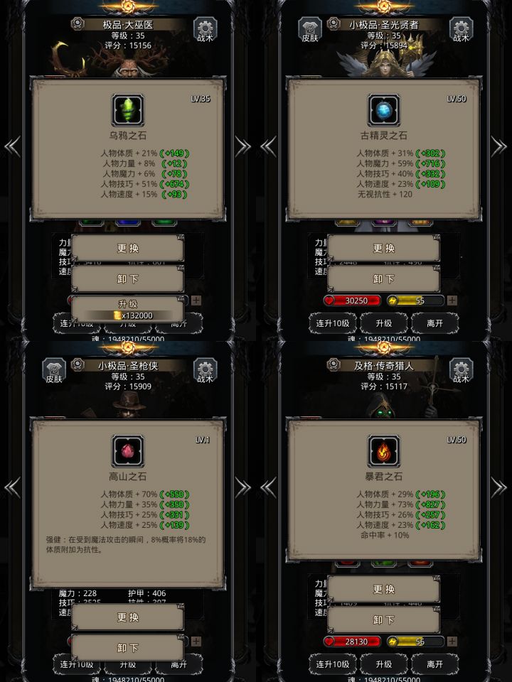 * {{配装|圣枪|独裁者,邪瞳大铠,亘古之冠,魔龙之心,高山之石}}保证血量基础上提高技巧,本人2603体3525技巧;