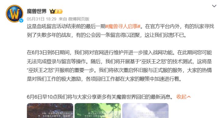 据《魔兽世界》官方动态,6月3日至6月5日,魔兽世界官网将进行维护并进一接入战网功能,并将在6月6日进一步公告更多信息。