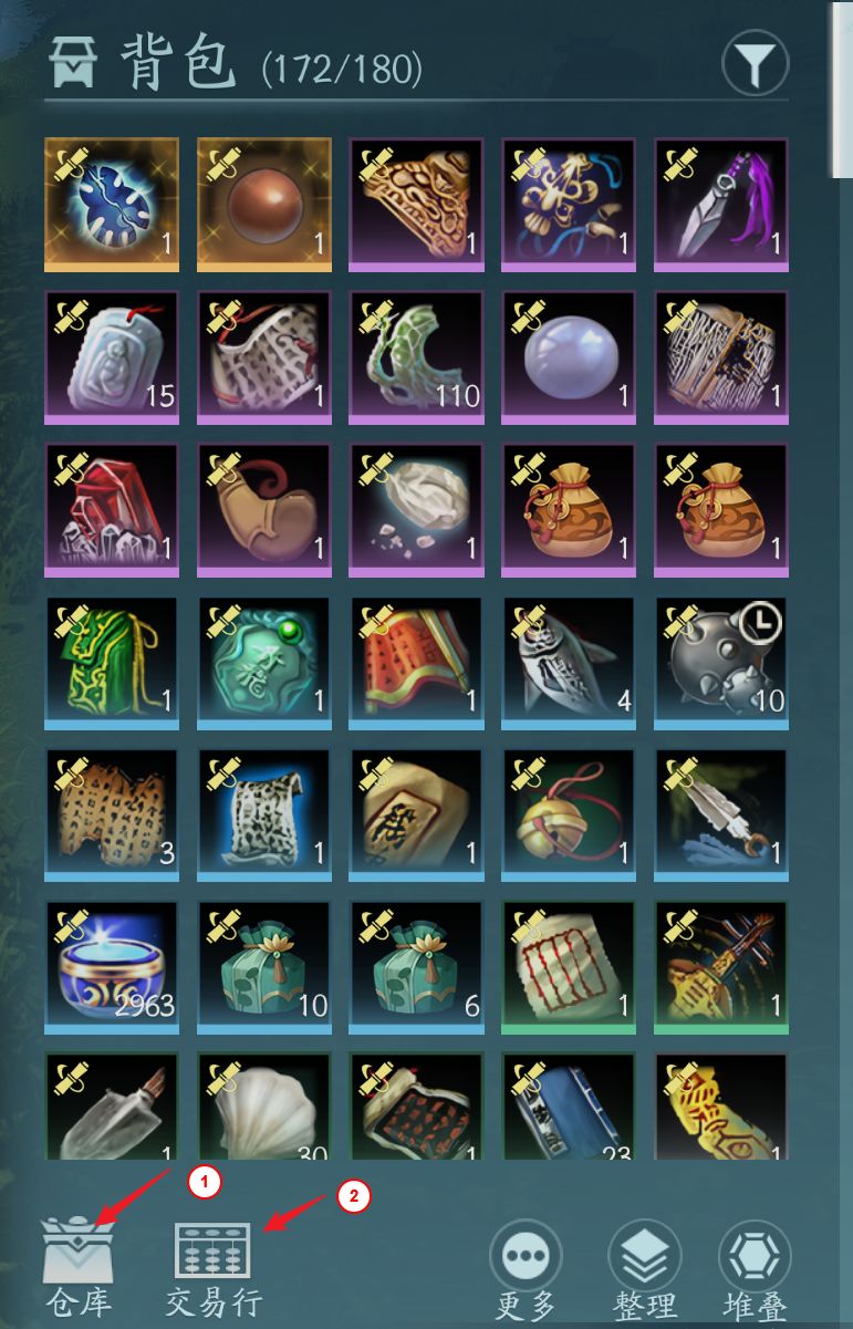 背包快捷按钮,可以打开你的随身背包,一般常用道具等我们都会放在背包,现在背包的左下角增加打开仓库和交易行的快捷按钮。你可以将你一些不常用的道具放到仓库存放。你有道具需要拍卖或购买时可以直接打开交易行搜索交易或者售卖。
