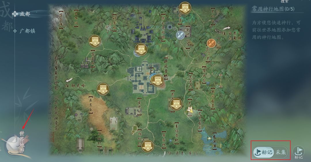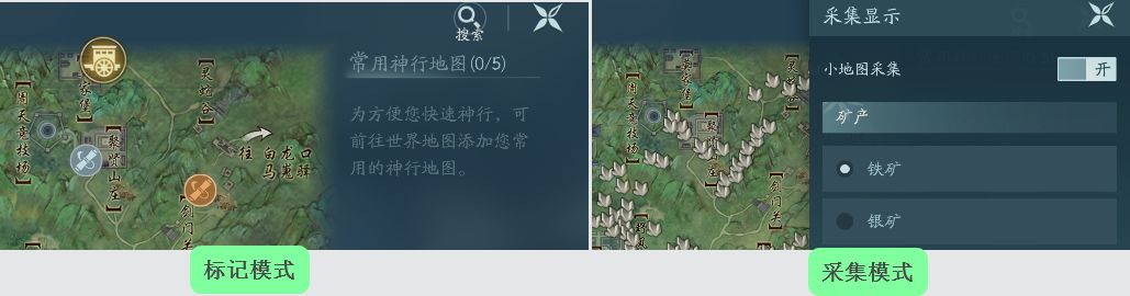 地图右下角可以切换地图信息显示类别,标记模式是我们经常用的模式,可以查看常用的NPC、任务等等,采集模式一般只有当我们需要进行生活材料采集时才使用,它会将我们需要采集的材料在地图上标示出大概位置。